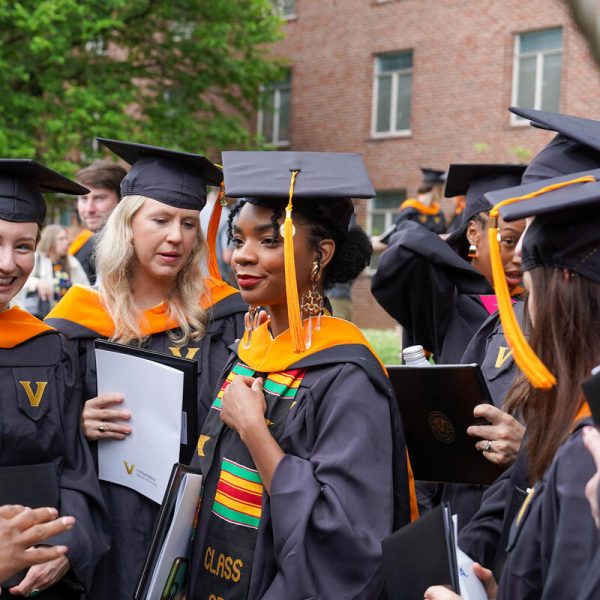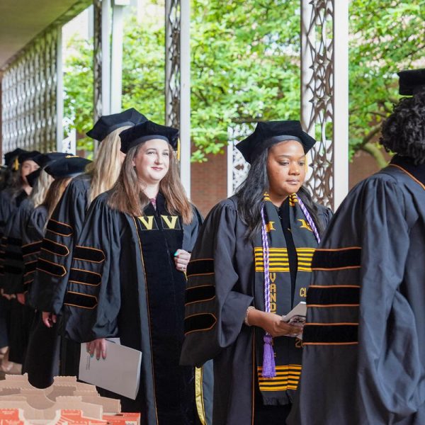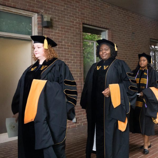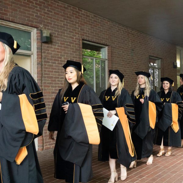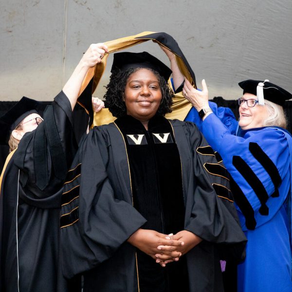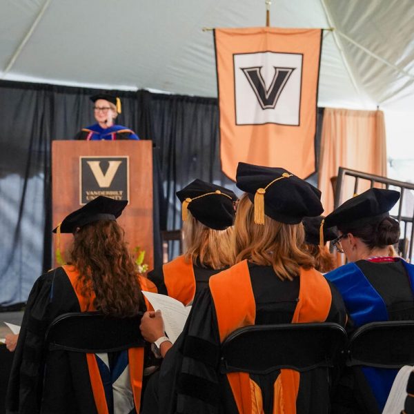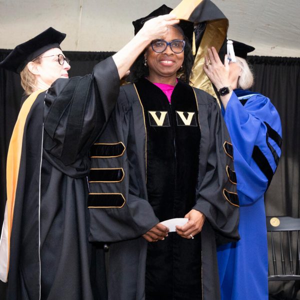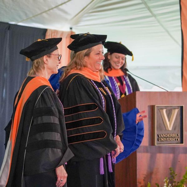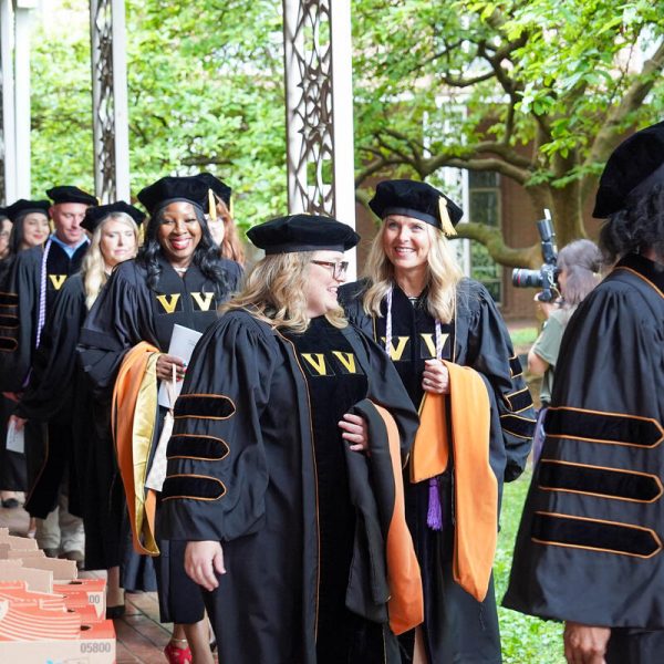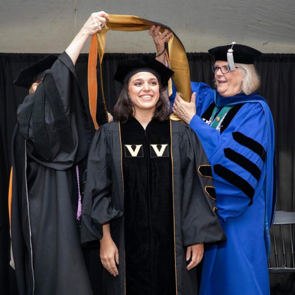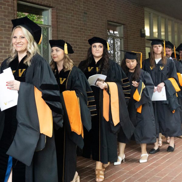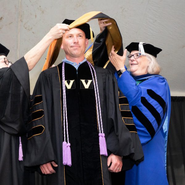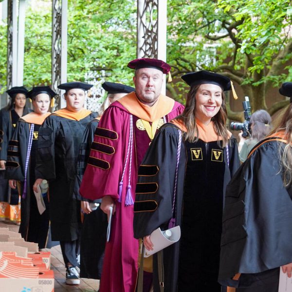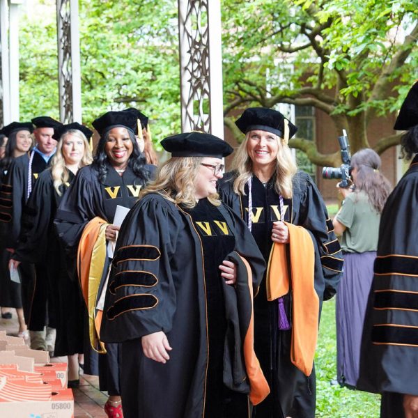 In a break from tradition, Vanderbilt graduate schools did not participate in the overall university Commencement ceremonies, held off campus due to weather concerns. Instead, nursing graduates and their guests went directly to Branscomb Quadrangle for the School of Nursing Investiture ceremony. As family, friends, faculty and staff looked on, students were hooded by their program specialty directors and academic directors.