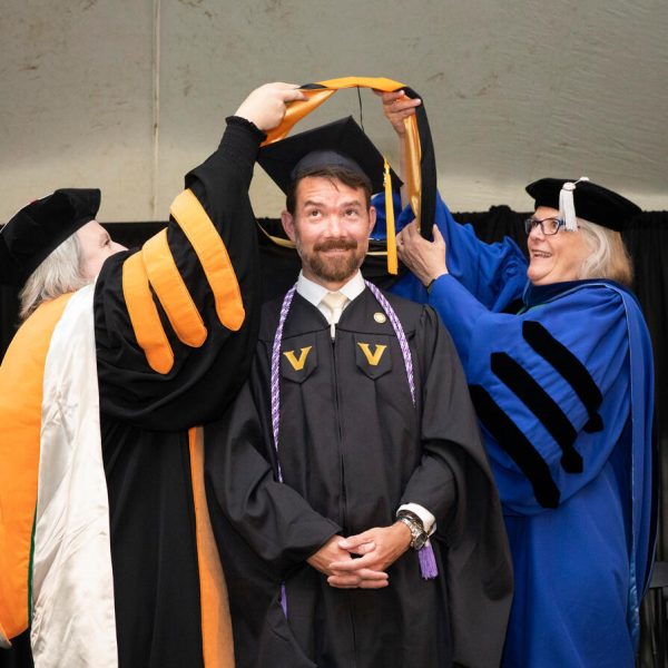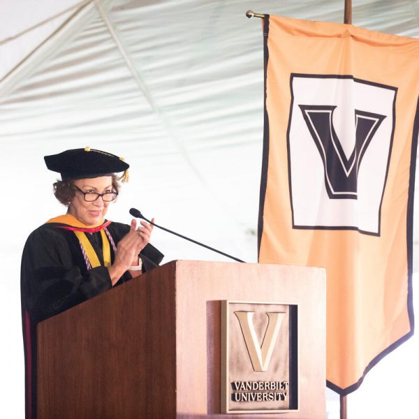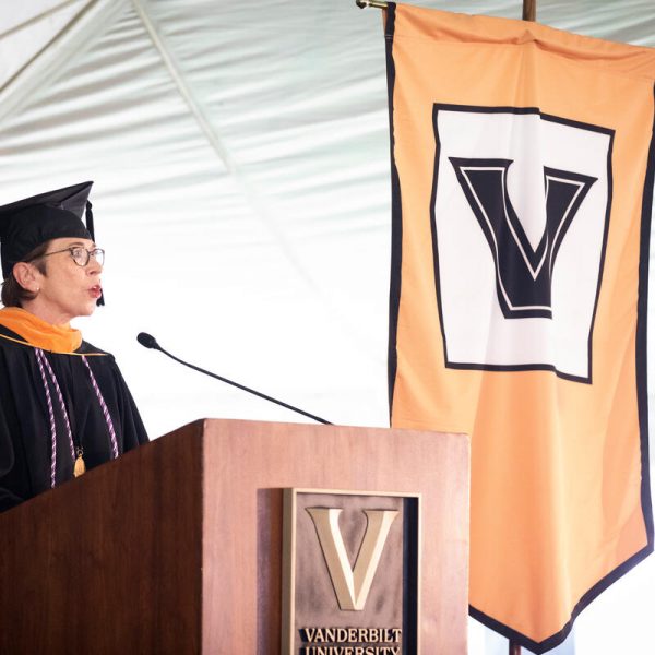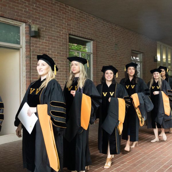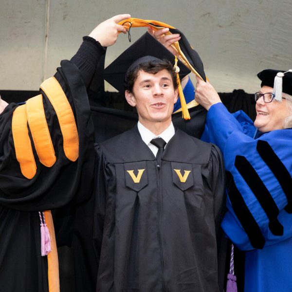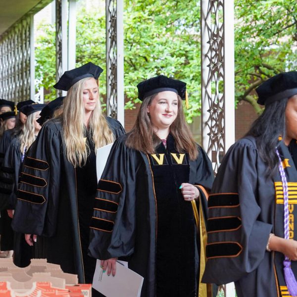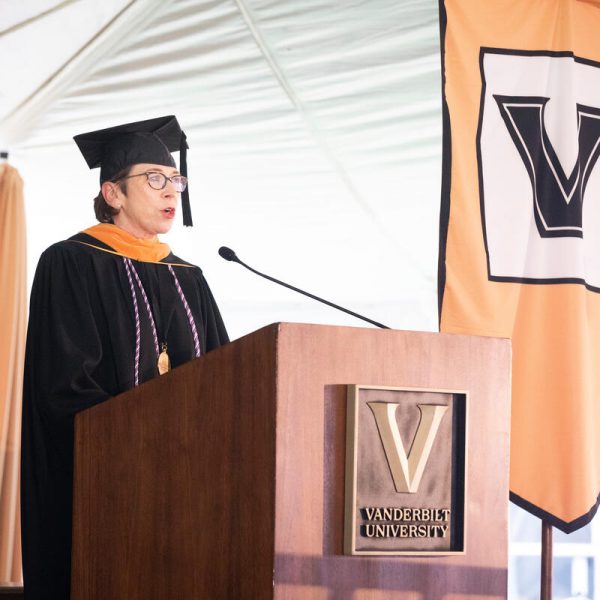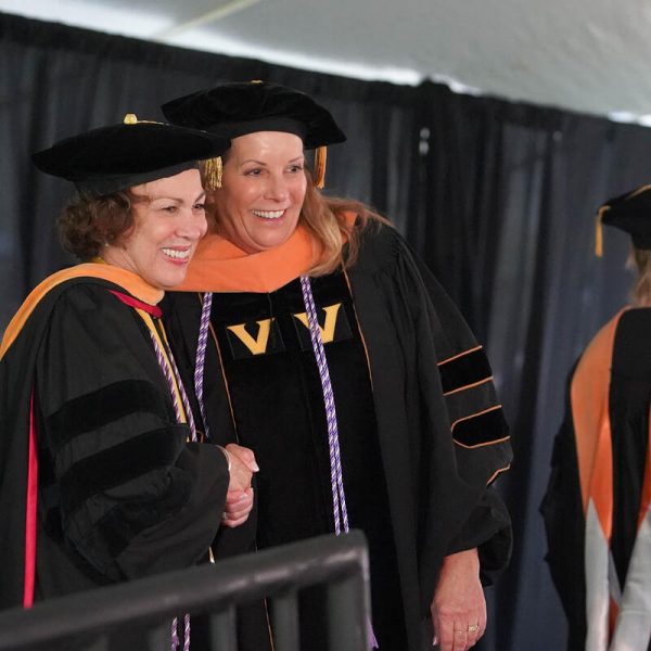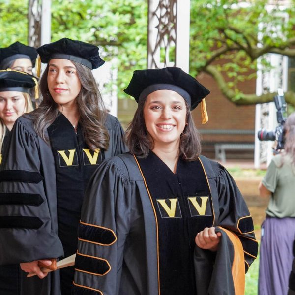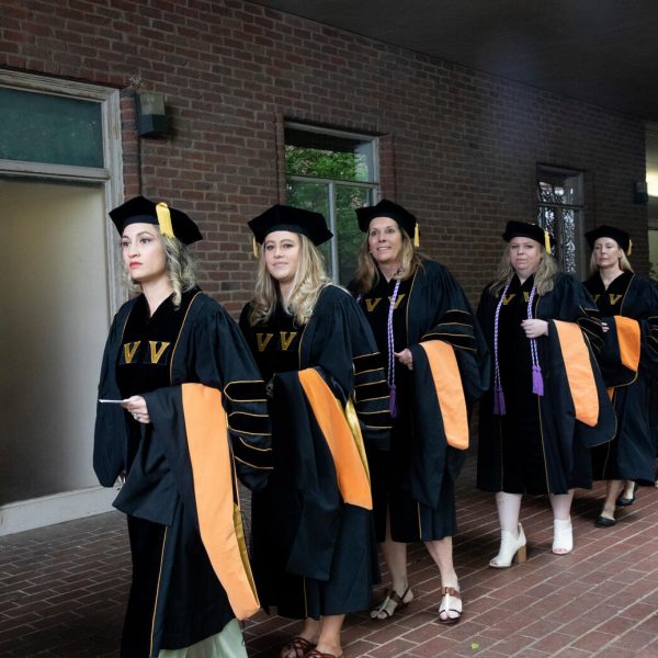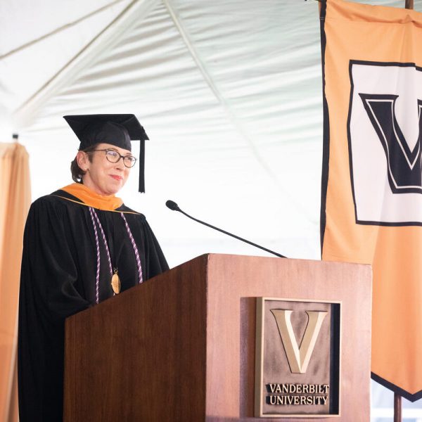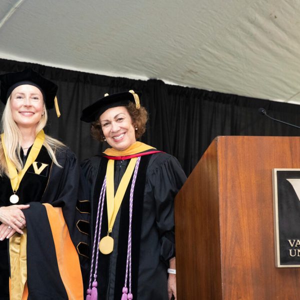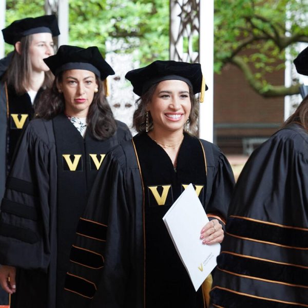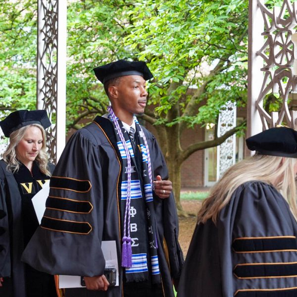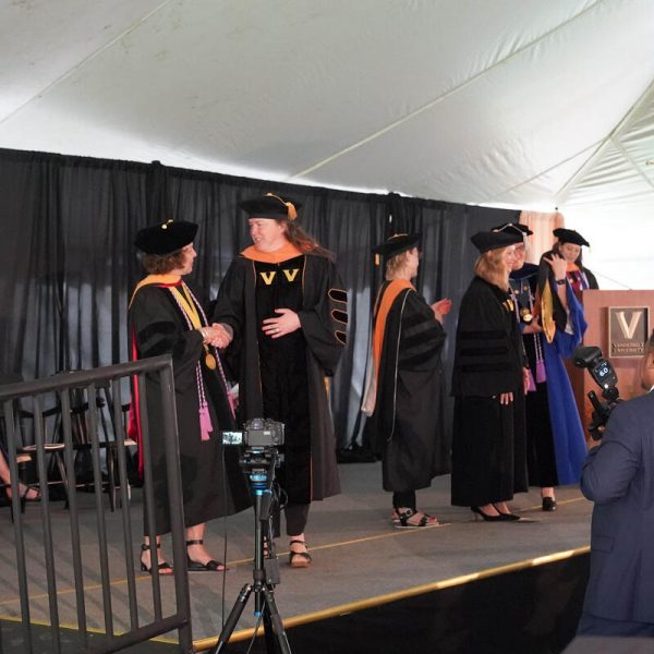 In a break from tradition, Vanderbilt graduate schools did not participate in the overall university Commencement ceremonies, held off campus due to weather concerns. Instead, nursing graduates and their guests went directly to Branscomb Quadrangle for the School of Nursing Investiture ceremony. As family, friends, faculty and staff looked on, students were hooded by their program specialty directors and academic directors.