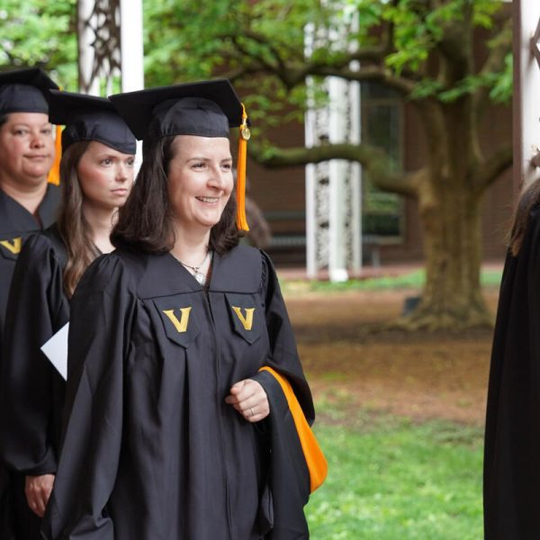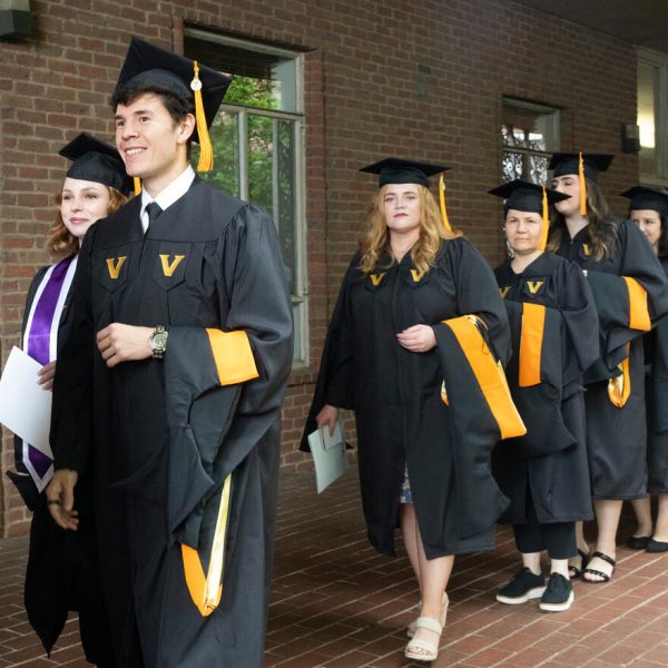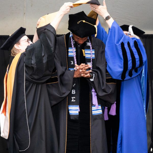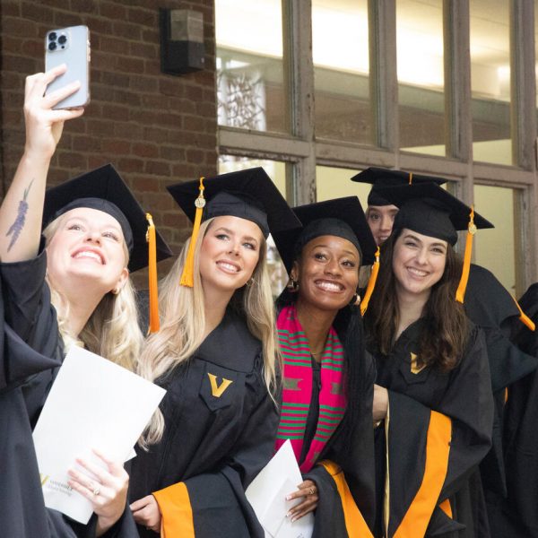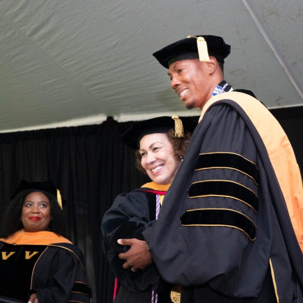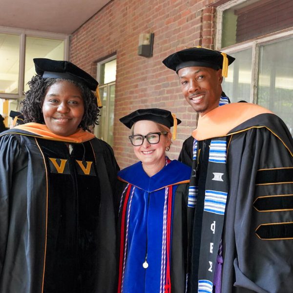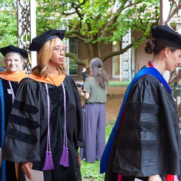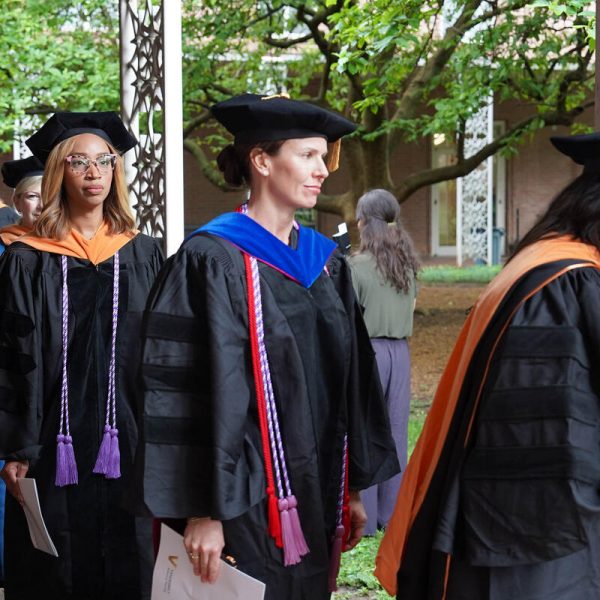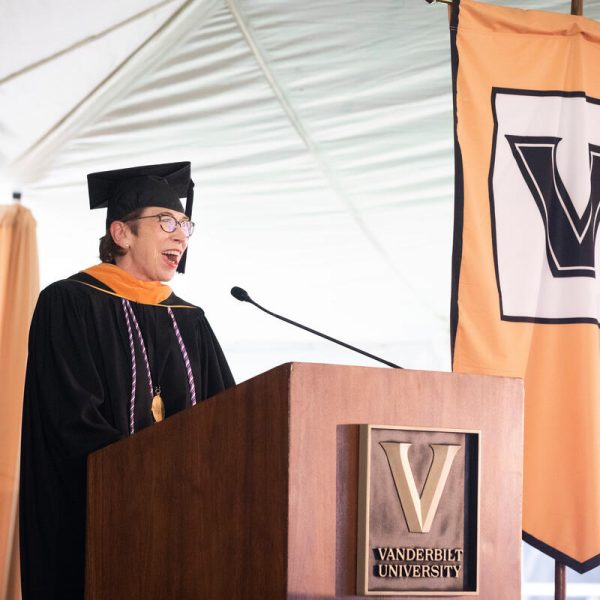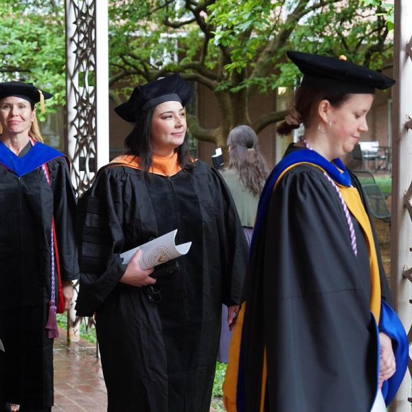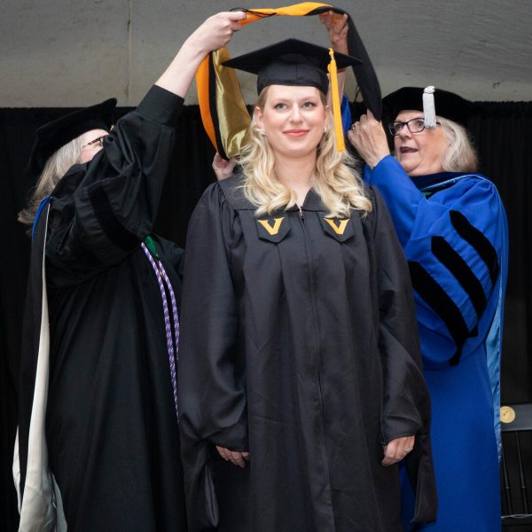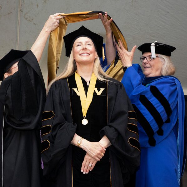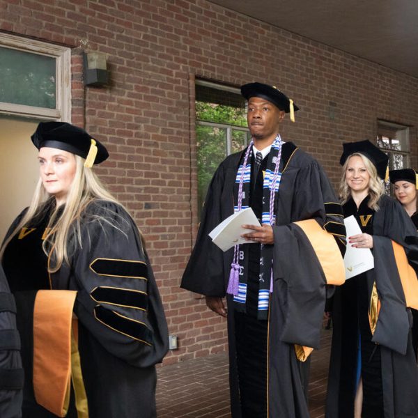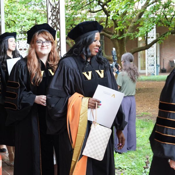 In a break from tradition, Vanderbilt graduate schools did not participate in the overall university Commencement ceremonies, held off campus due to weather concerns. Instead, nursing graduates and their guests went directly to Branscomb Quadrangle for the School of Nursing Investiture ceremony. As family, friends, faculty and staff looked on, students were hooded by their program specialty directors and academic directors.