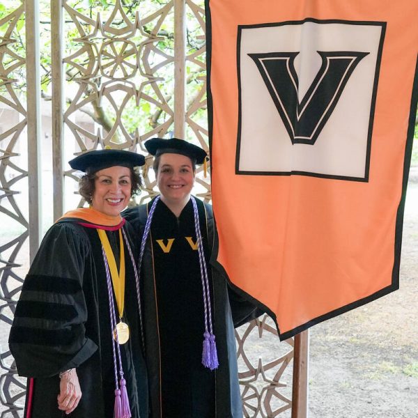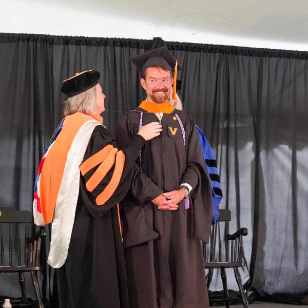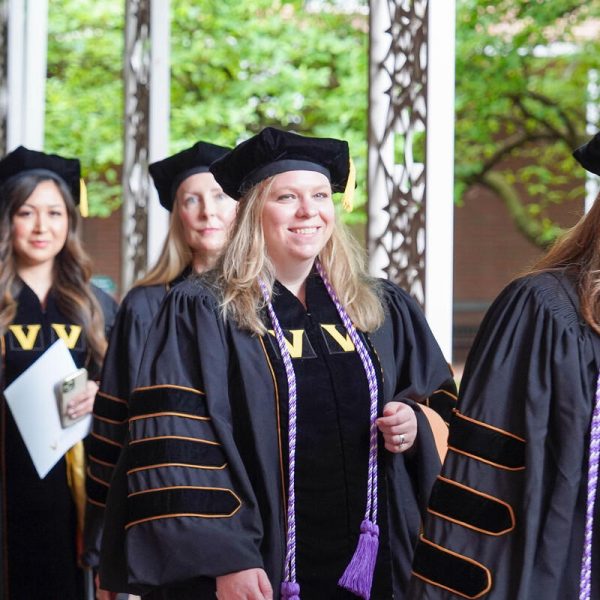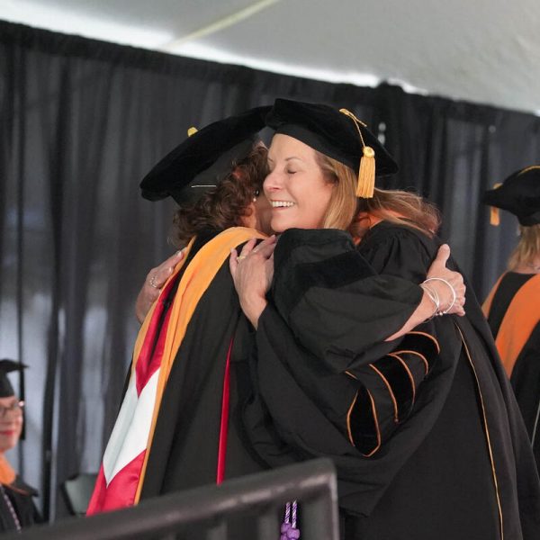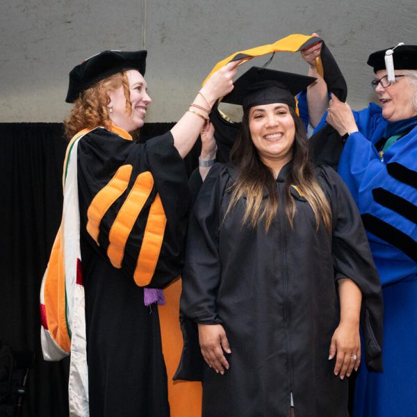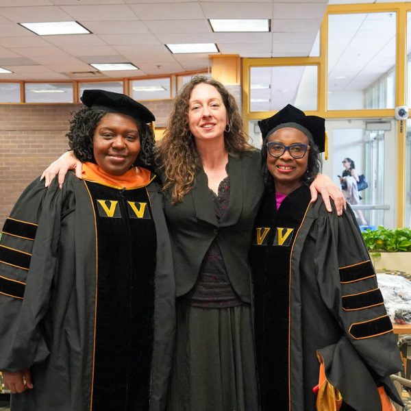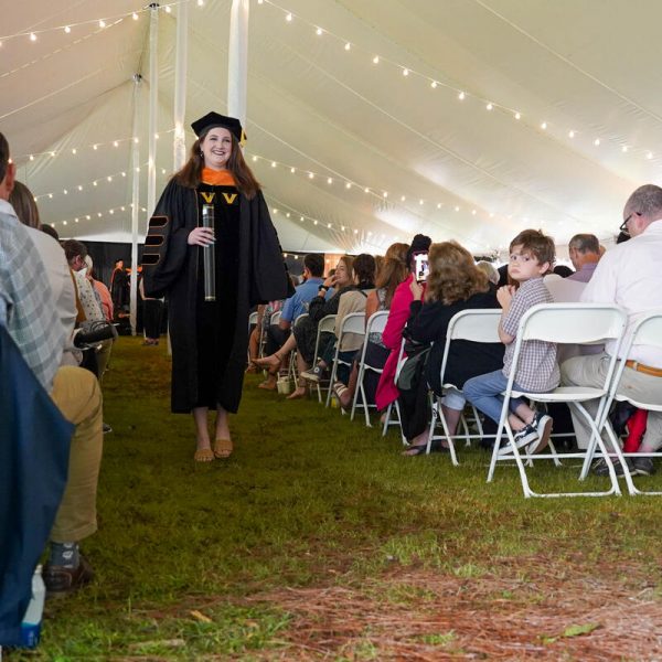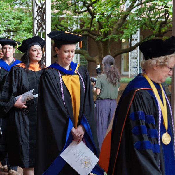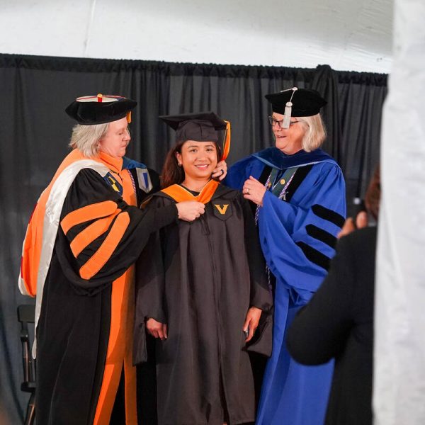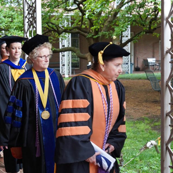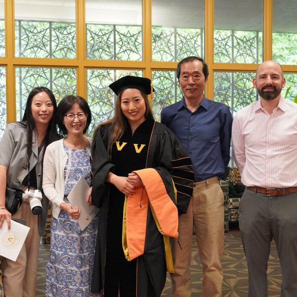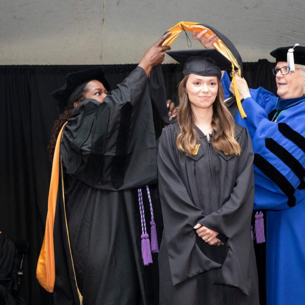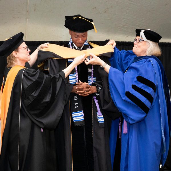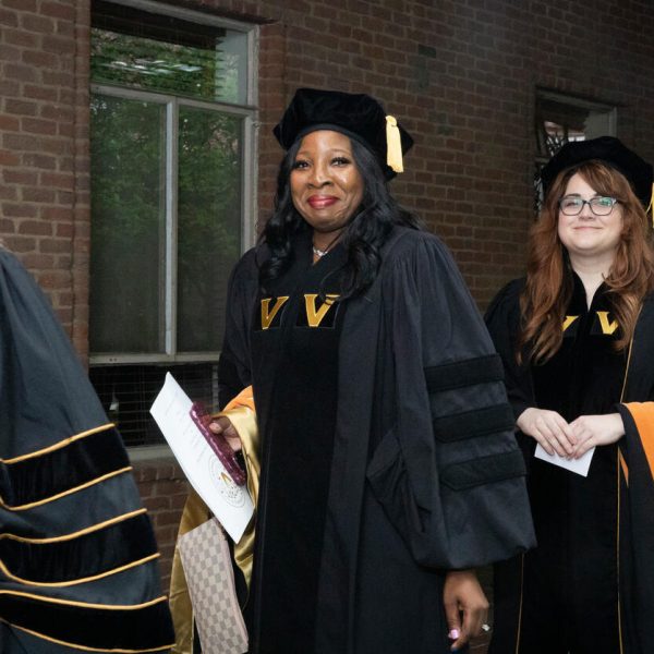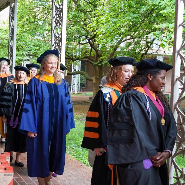 In a break from tradition, Vanderbilt graduate schools did not participate in the overall university Commencement ceremonies, held off campus due to weather concerns. Instead, nursing graduates and their guests went directly to Branscomb Quadrangle for the School of Nursing Investiture ceremony. As family, friends, faculty and staff looked on, students were hooded by their program specialty directors and academic directors.